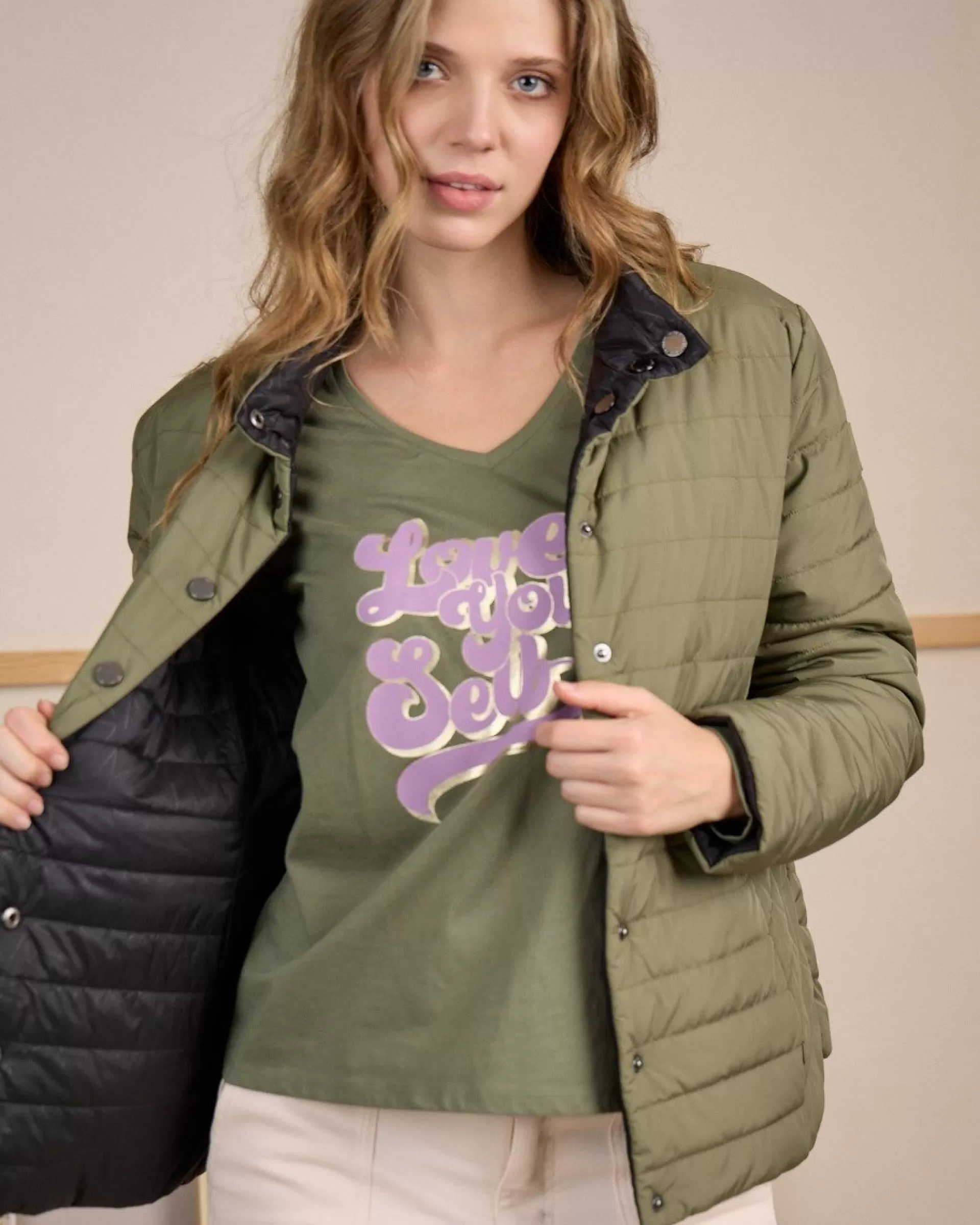 Envie de changer de style selon vos humeurs ? À la fois technique et esthétique, cette doudoune réversible s’adapte à vos envies. Chaude, légère et pratique : elle a tout bon ! Selon l’occasion, choisissez la face noire au fini déperlant ou la face kaki en tissu. Ce modèle présente une fermeture boutonnée, des poches latérales et un patch Mise au Green. Deux styles, deux ambiances, et un maximum de style !