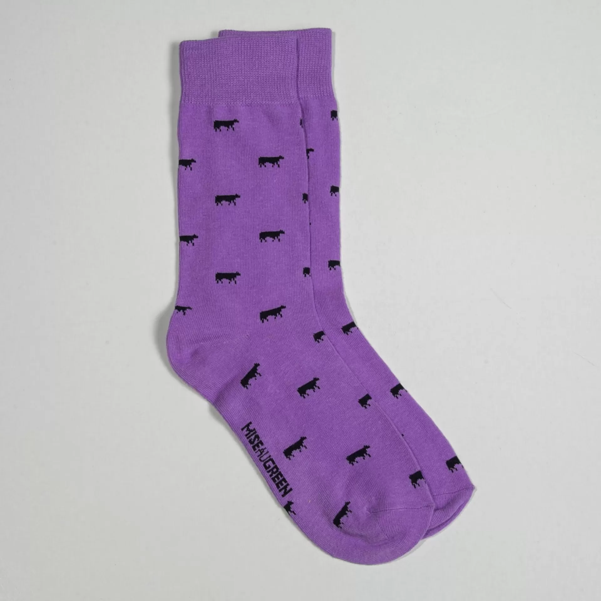 Des petites vaches s’invitent sur vos pieds avec ces chaussettes pour homme ! En plus d’apporter une touche de fantaisie à votre tenue, elles sont aussi très confortables. Leur tissu élastique et doux – mélange de coton, polyamide et élasthanne – ainsi que ses bords-côtes larges permettent un maintien confortable sur la jambe. Fini les chaussettes trop sobres : osez son coloris parme ! Petite anecdote : la vache est l’animal emblématique de notre marque Mise au Green en hommage au grand-père de nos fondateurs qui fut marchand de bestiaux. Il n’a donc pas été choisi au hasard sur cet accessoire original !