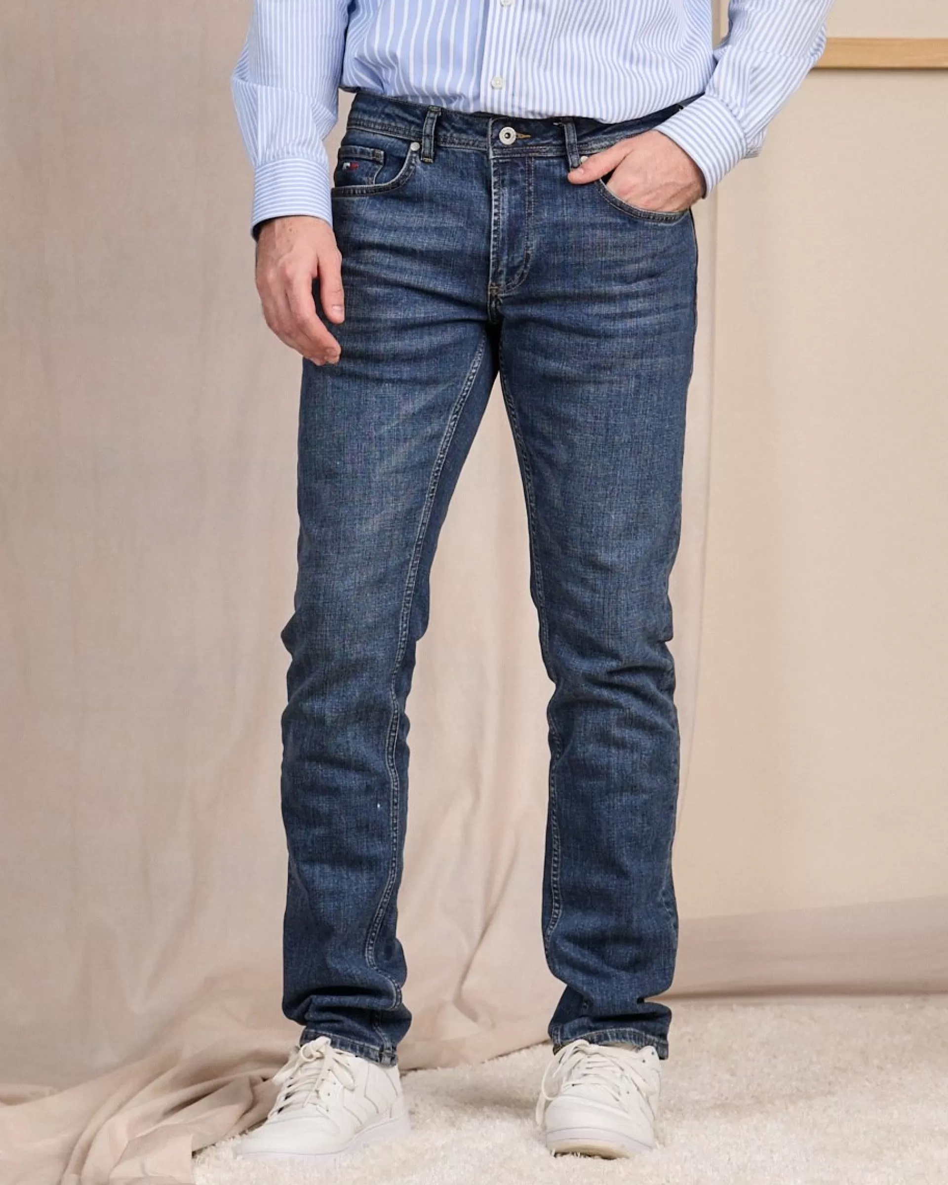 Au quotidien, ce jean bleu médium sera votre meilleur allié ! Son design résolument moderne est sublimé par un léger délavage, cinq poches et une coupe ajustée qui flatte la silhouette en toute simplicité. Pour plus de souplesse et de confort, il est confectionné dans un mélange de coton et élasthanne. Un logo brodé 3 vaches au niveau des poches ainsi qu’un jacron Mise au Green signent cette pièce intemporelle. Associez-la avec n’importe quel haut de votre vestiaire pour une allure dans l’air du temps.
