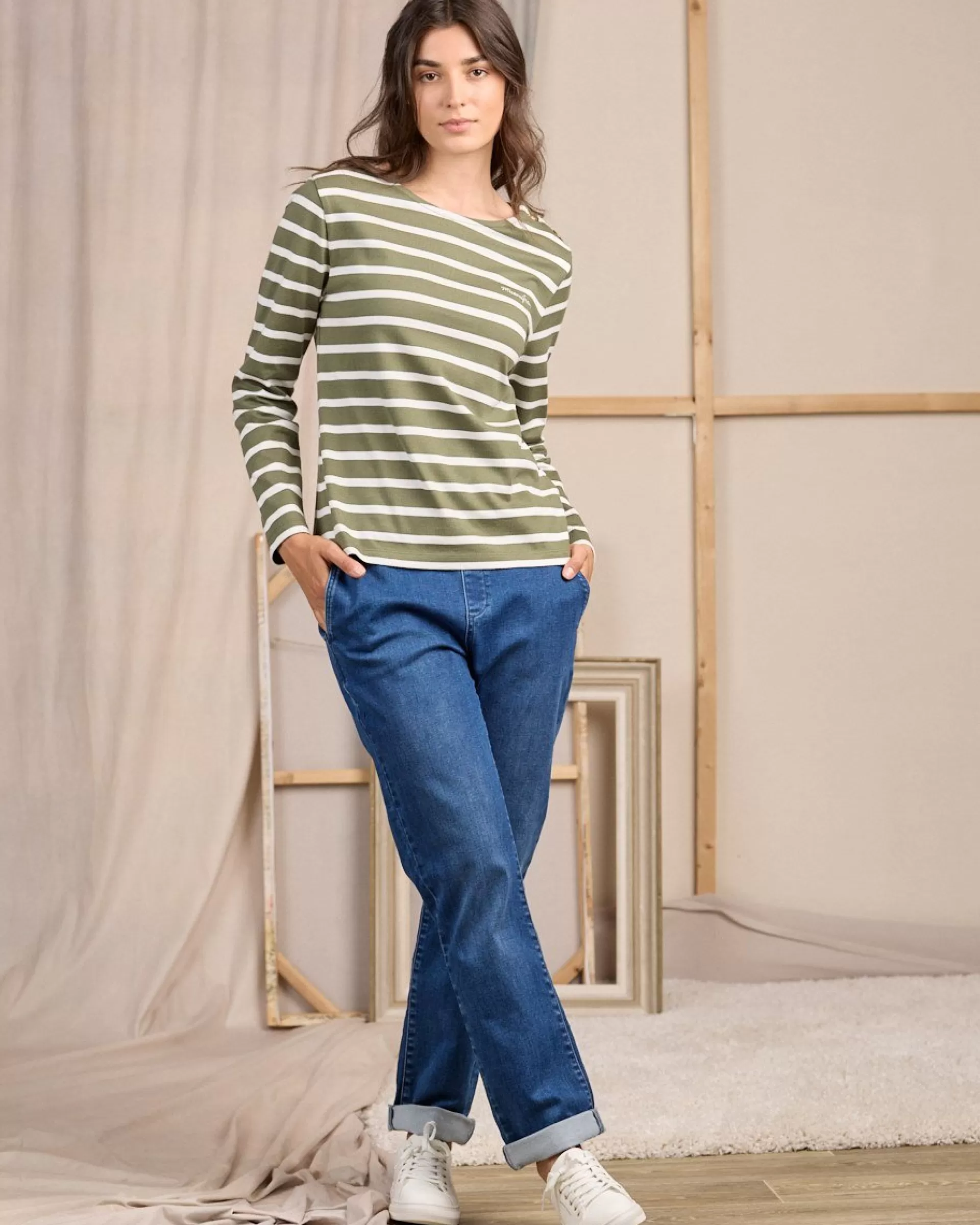 Inspiré du vestiaire marin, ce tee-shirt marinière à manches longues pour femme est déjà iconique ! Sa matière en coton issu de l’agriculture biologique le rend agréable à porter et respirant. Grâce à son imprimé à rayures et son coloris kaki, ce modèle mêle décontraction et élégance avec facilité ! Des détails raffinés comme sa patte de boutonnage à deux boutons dorés et son col rond complètent cet essentiel.