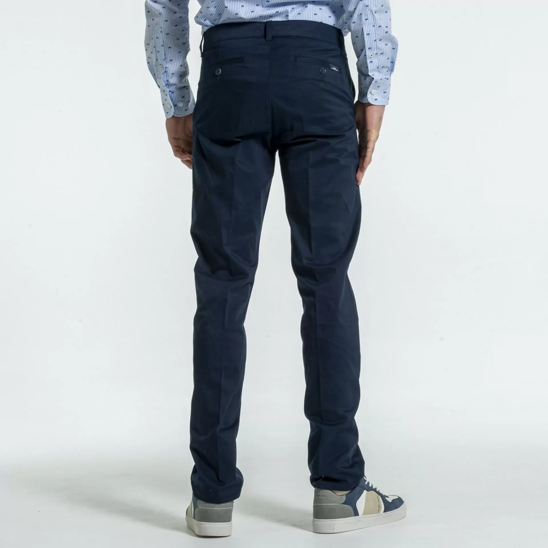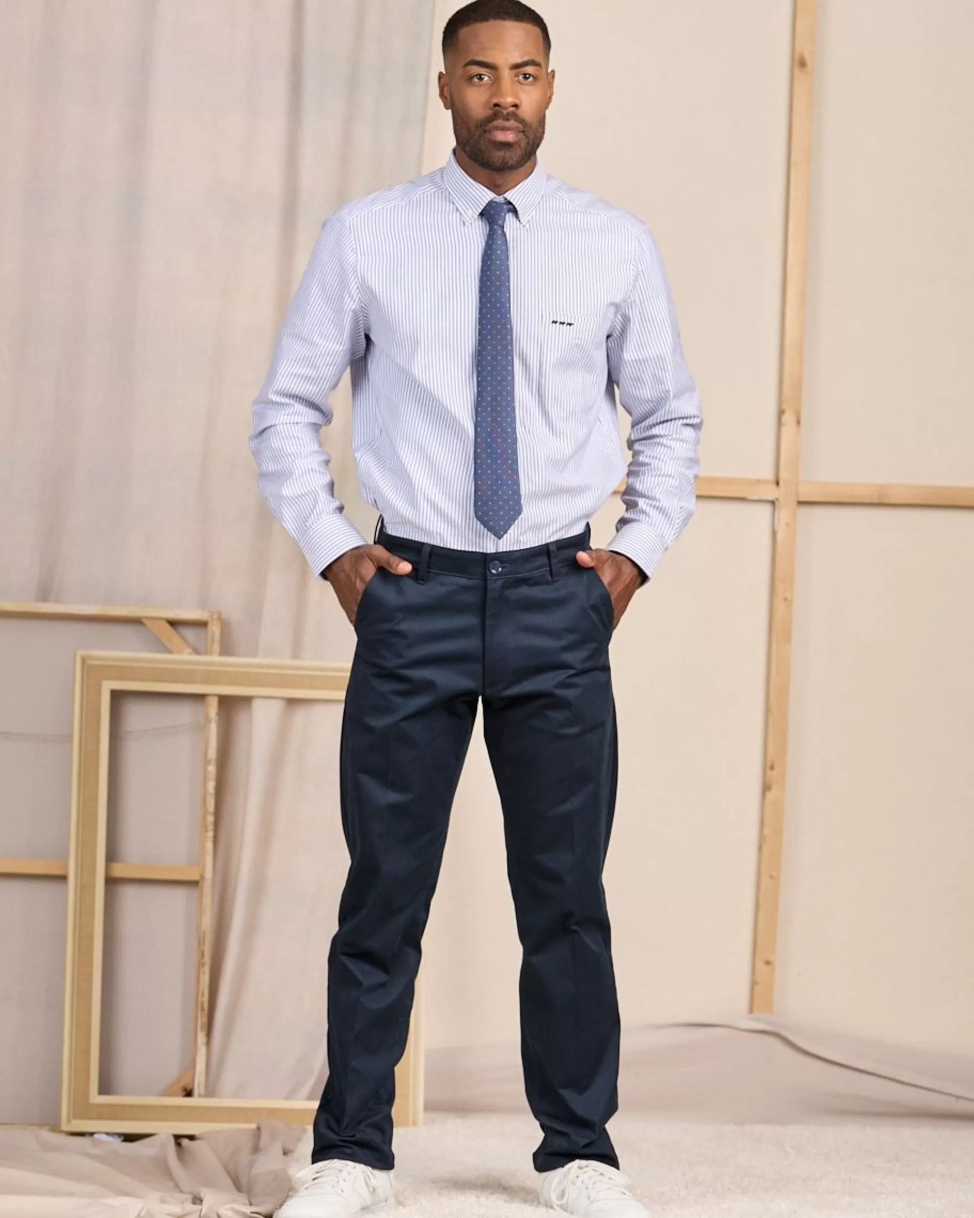 À la fois élégant et décontracté, le pantalon chino fait partie intégrante de tous les placards ! Notre modèle Mise au Green est décliné dans un coloris bleu marine qui permet de créer une variété de looks différents. Pour une soirée chic, un week-end entre amis ou une journée au travail : il s’adapte à toutes les occasions. Très confortable et légèrement stretch, il est conçu avec du coton et une pointe d’élasthanne. Son atout ? Sa coupe droite qui crée une silhouette harmonieuse. Pour plus de style, ce pantalon comprend deux poches sur le devant, des passants pour ceinture et deux fausses poches à l’arrière.