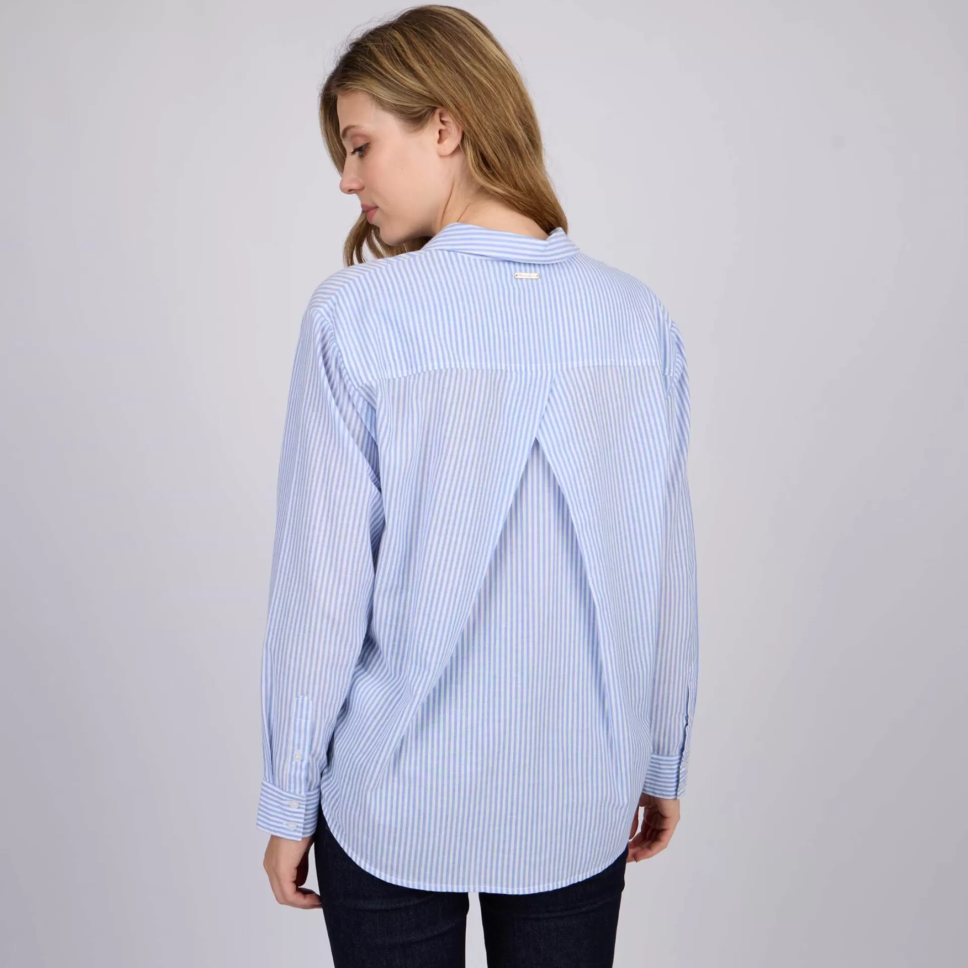 Mise au Green revisite la chemise à rayures dans une version féminine ultra tendance. Ce modèle bleu ciel affiche une poche sur la poitrine, des poignets boutonnés et un pli au creux du dos. Portez ce haut chic avec une jupe ou un pantalon selon vos envies ! La touche finale : ses boutons effet nacré et sa petite plaquette dorée à l’arrière.