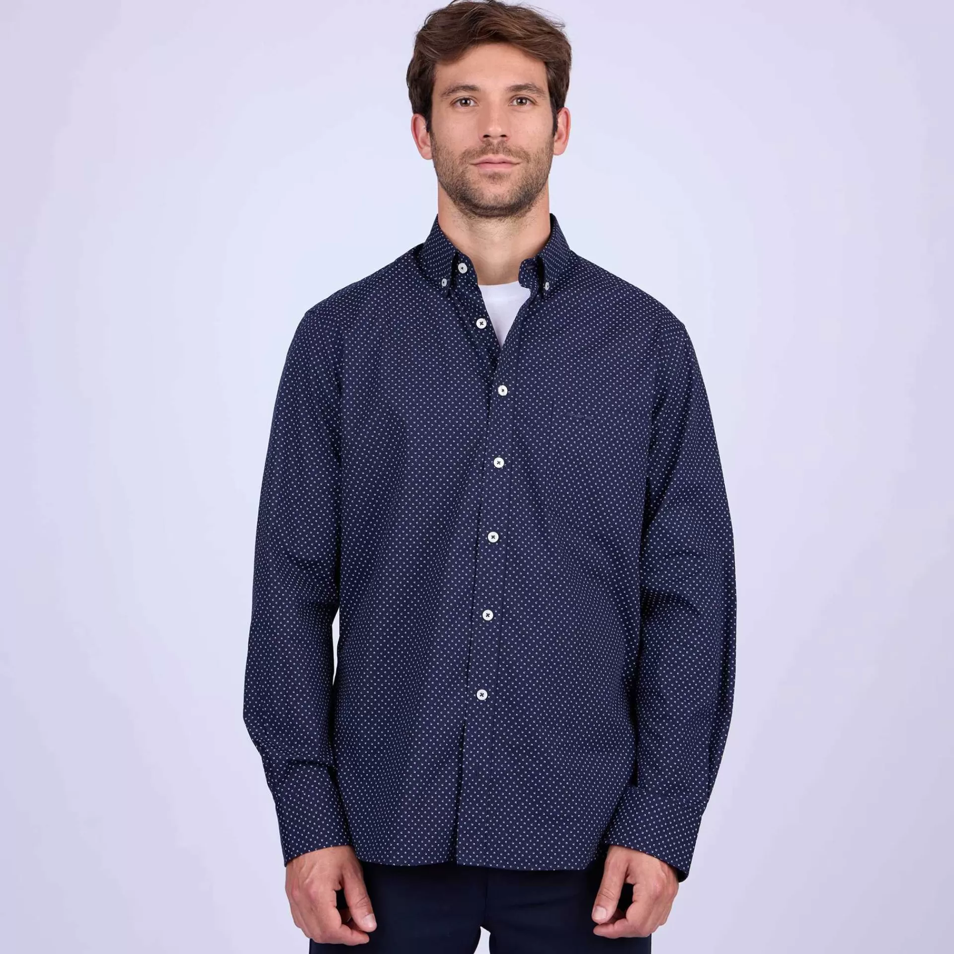 Associant un imprimé micro-motif avec un coloris bleu marine, cette chemise pour homme incarne l’essence même du raffinement. Réalisée en coton, elle a été pensée pour que vous soyez à l’aise tout au long de la journée. Elle présente un col boutonné, une poche poitrine et une broderie ton sur ton « 3 vaches ». Un modèle idéal pour se démarquer avec élégance !
