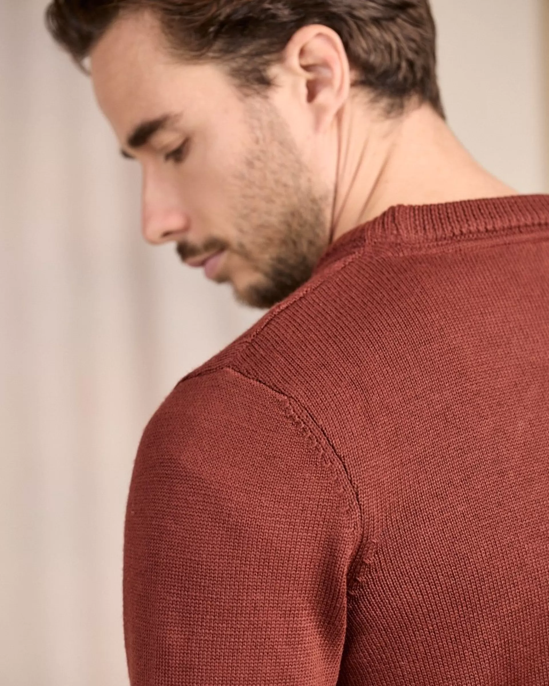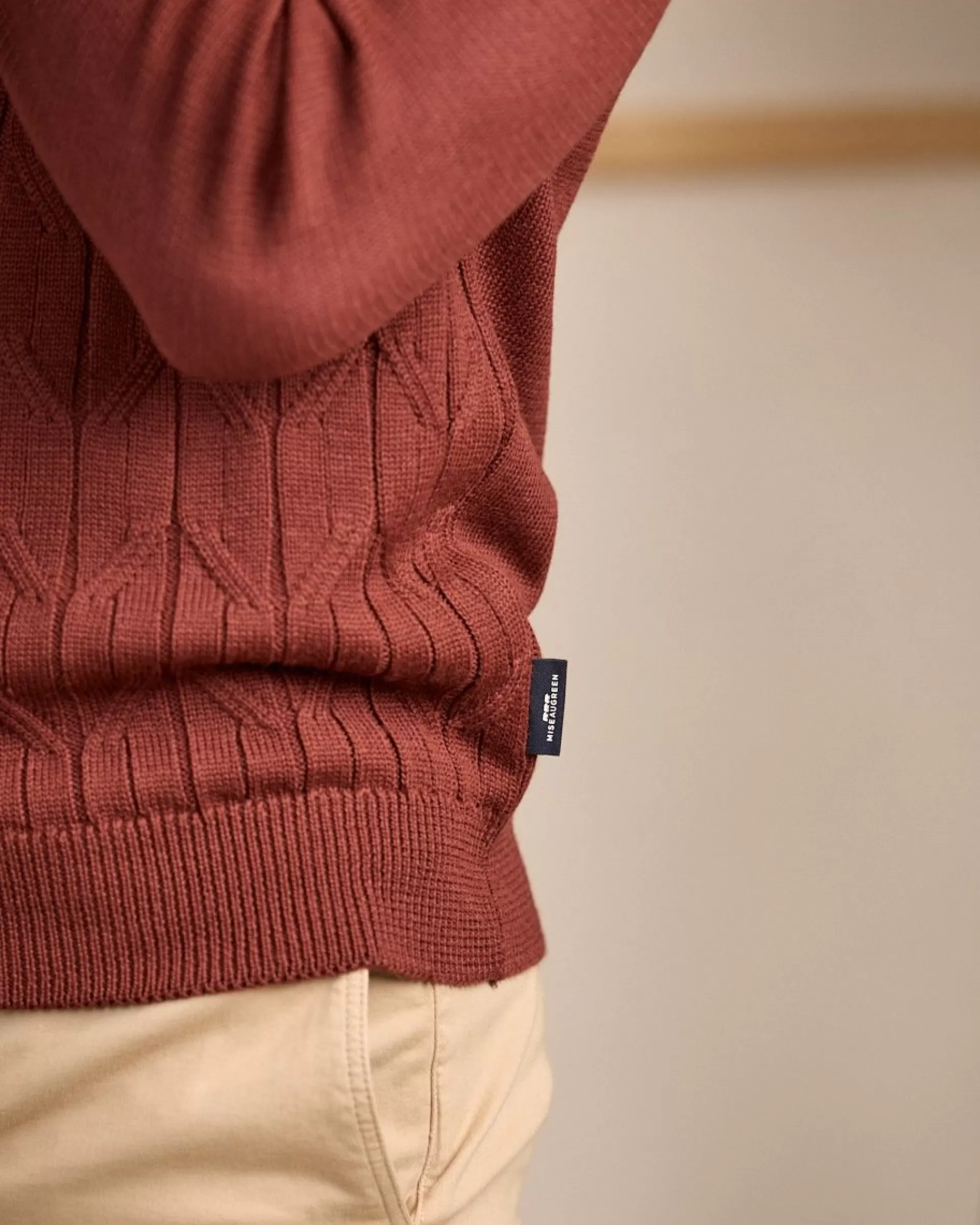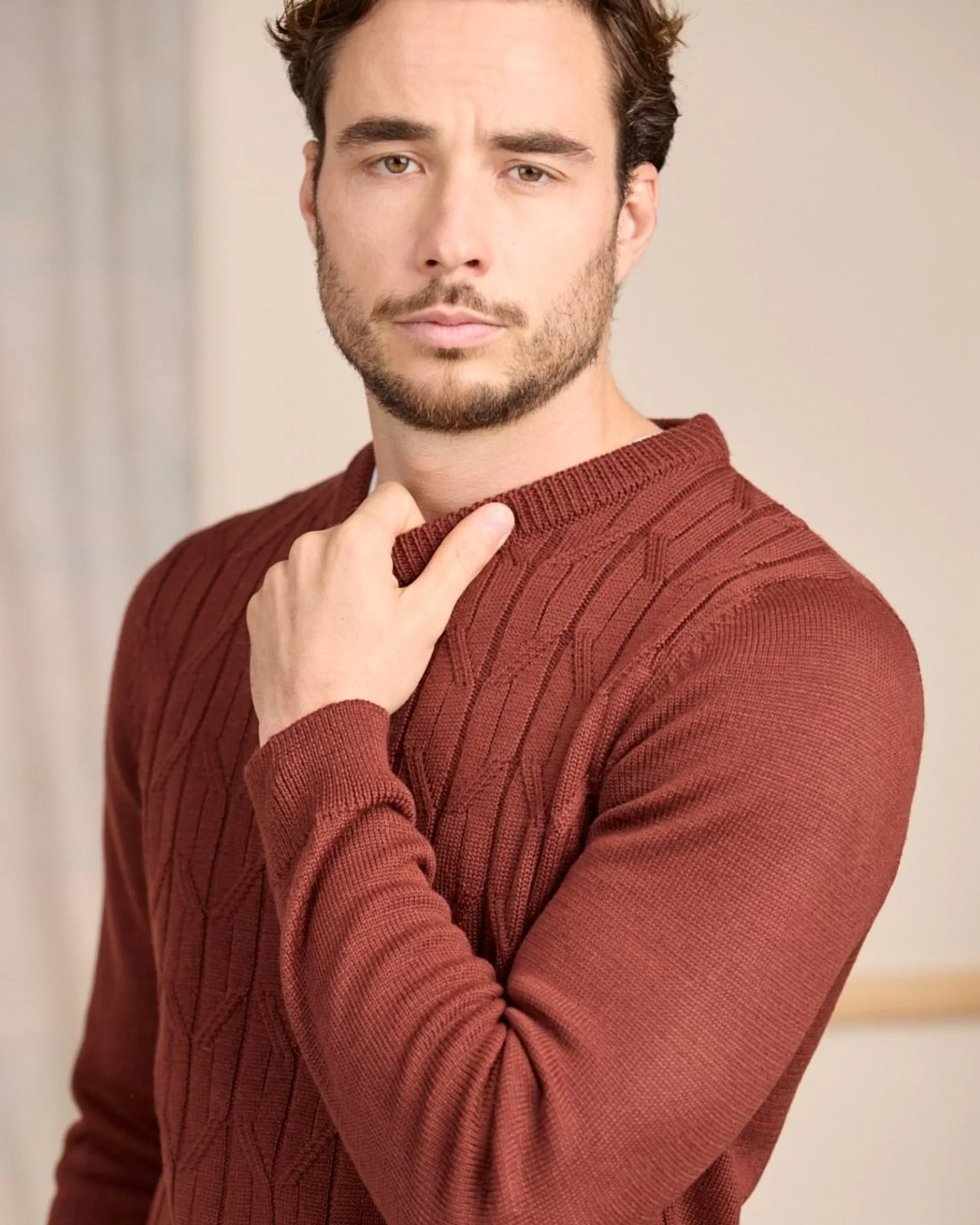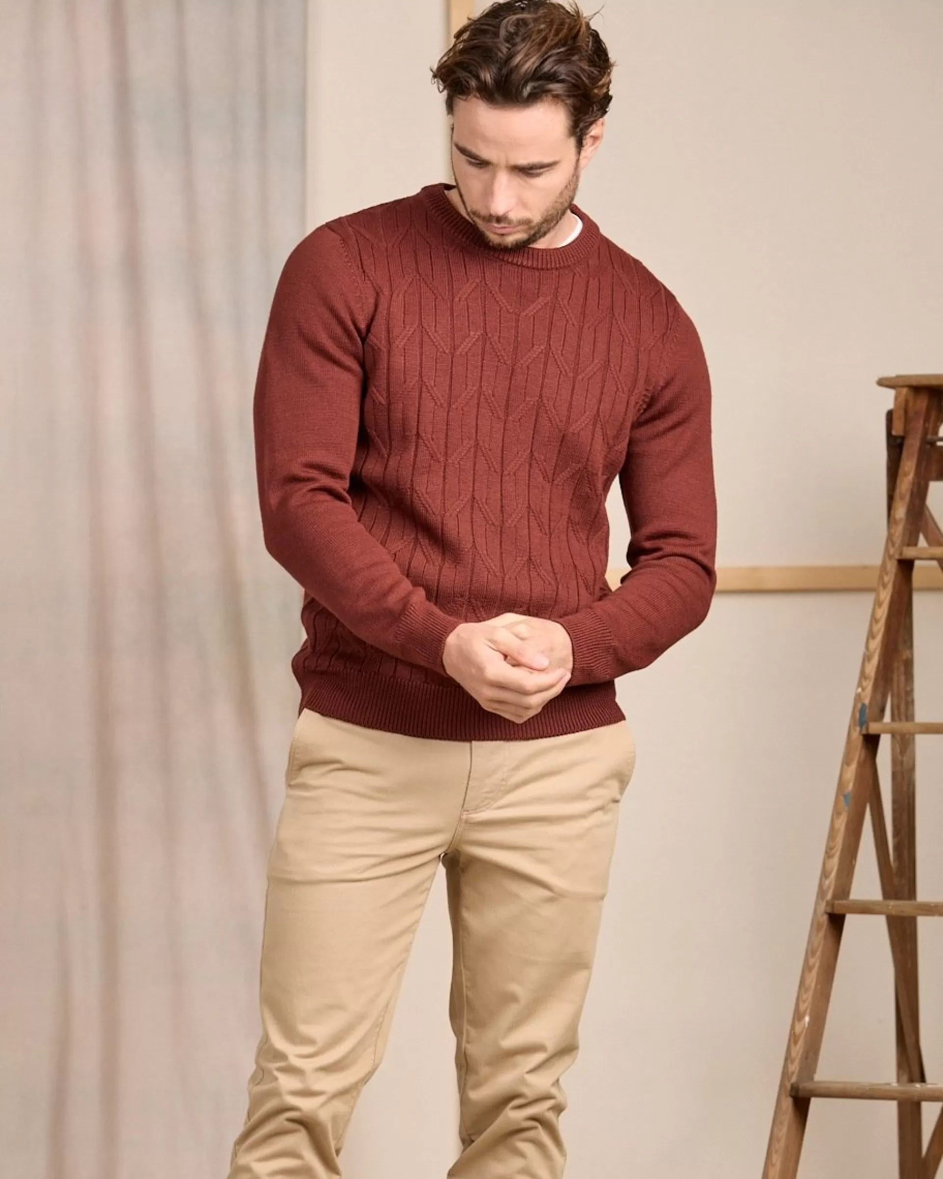 Idéal pour un style soigné, ce pull à col rond est une pièce de choix à posséder dans son vestiaire ! Ce modèle en laine mérinos et acrylique est confortable, robuste et respirant. Réalisé en maille torsadée, il possède une texture prononcée qui fait toute la différence. Des détails côtelés bordent le bas, les poignets et le col. Son coloris terracotta convient aussi bien pour une tenue urbaine chic qu’un look décontracté !