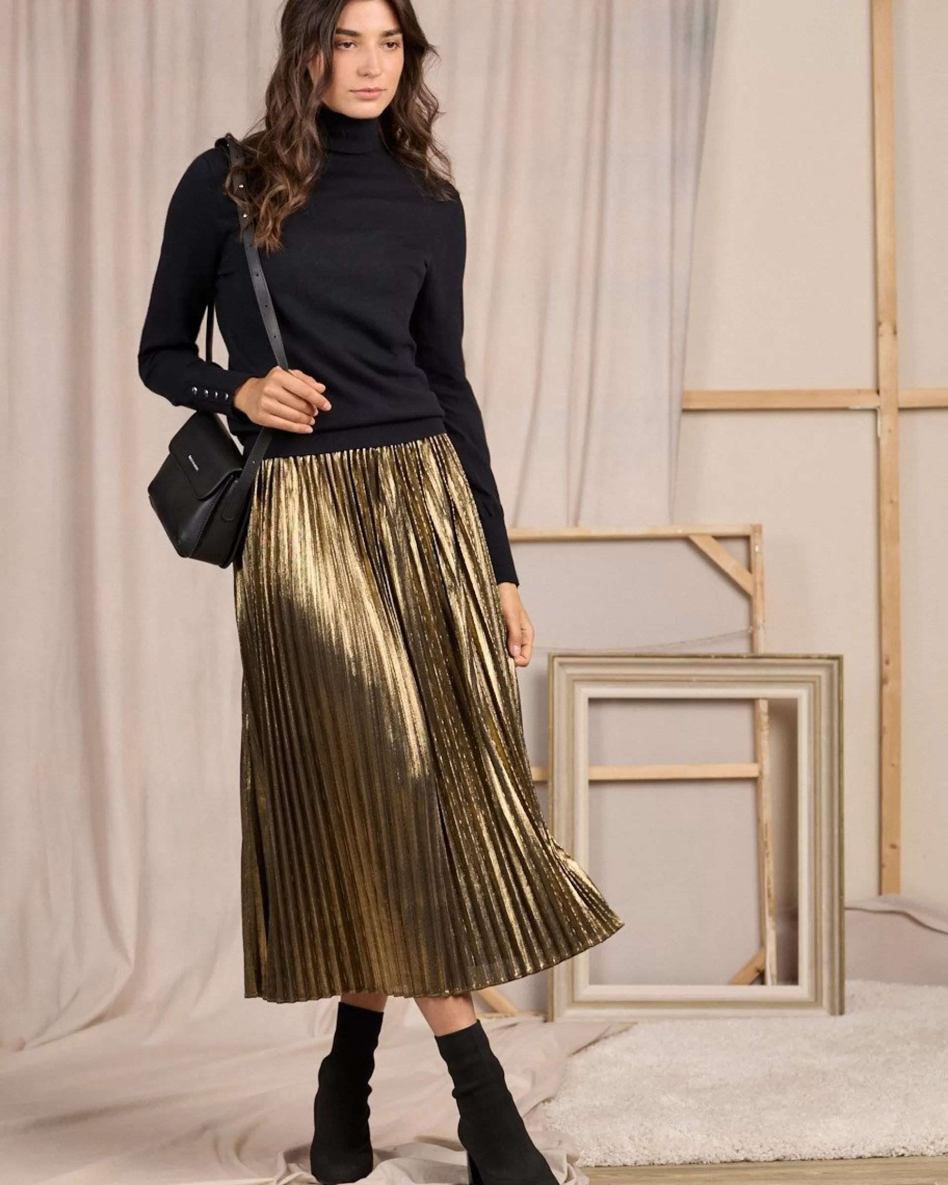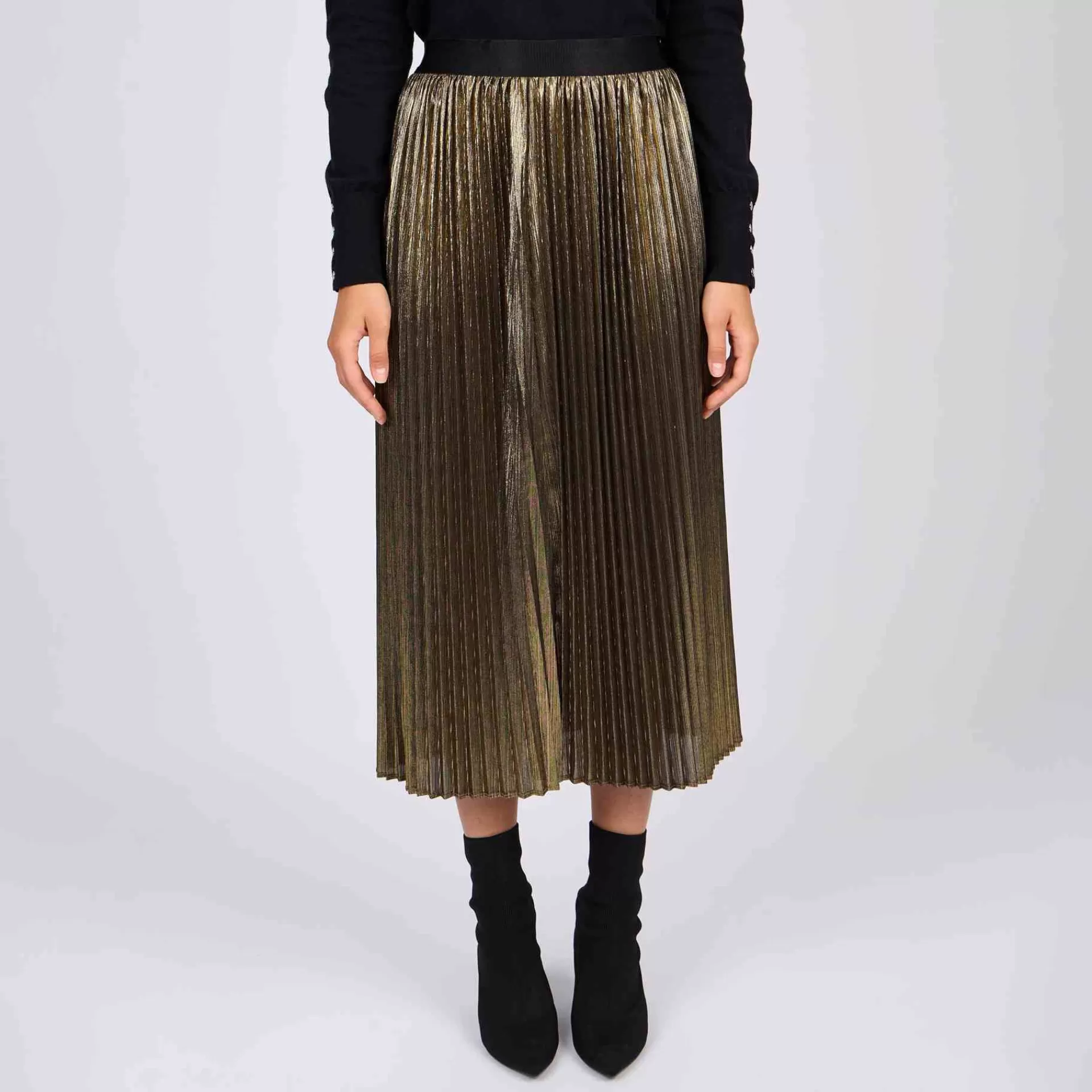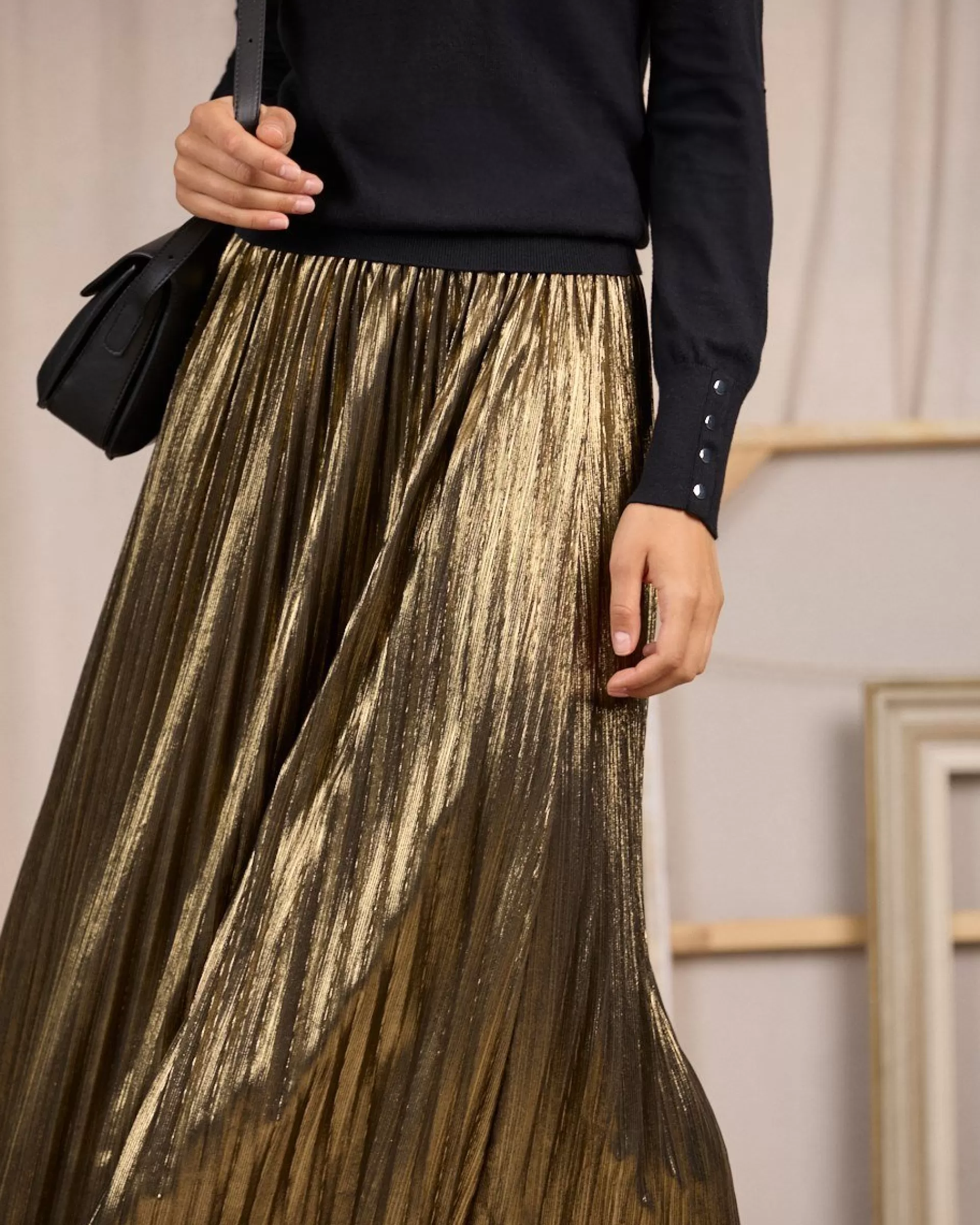 Pour dynamiser un look, laissez-vous séduire par cette jupe longue dorée ! Grâce à son tombé fluide, sa taille élastique et sa conception taille haute, elle apporte soutien et confort. Son tissu lumineux et sa finition plissée sublimeront votre silhouette avec élégance ! Portez-la en toute saison avec une paire de boots pour une tenue féminine et sophistiquée.
