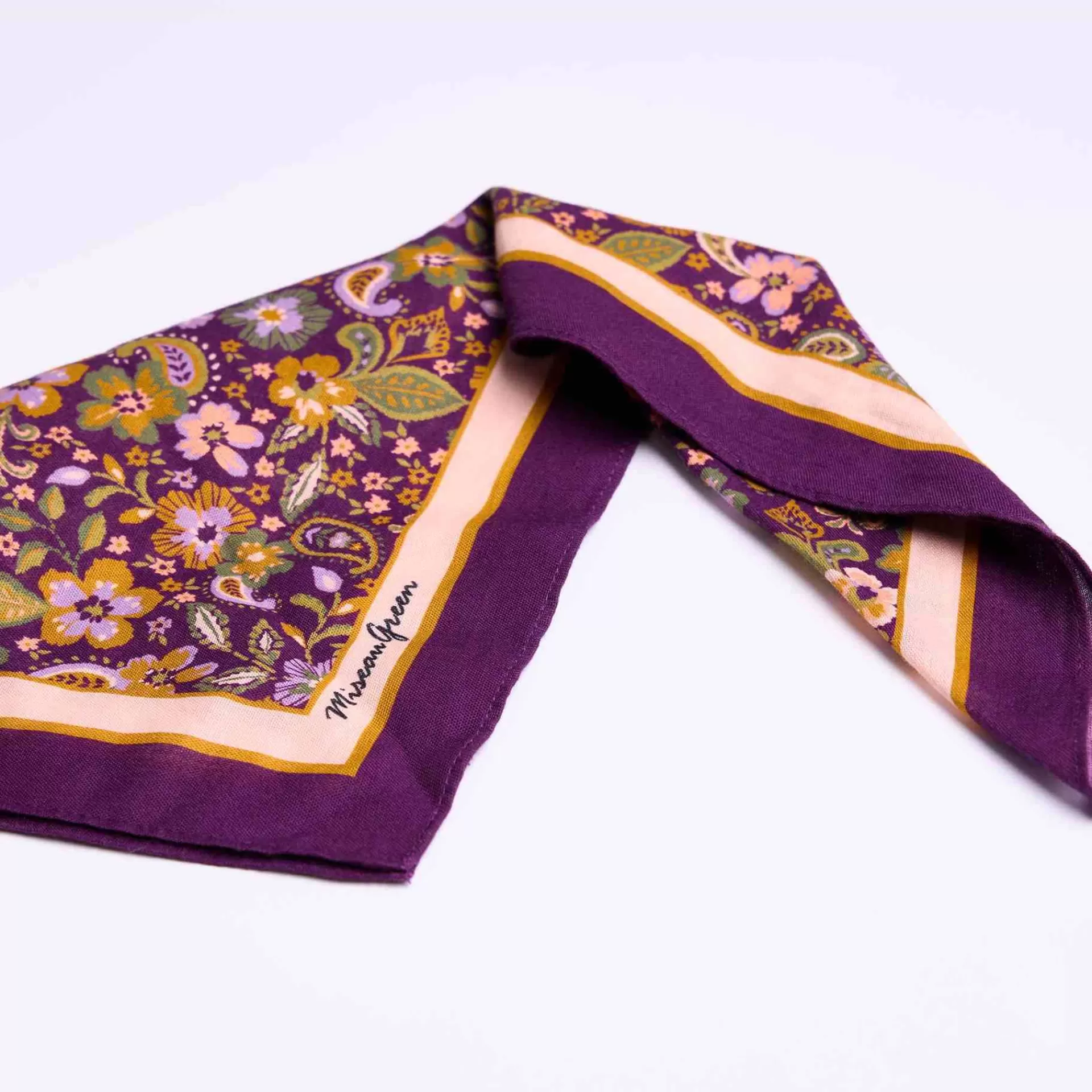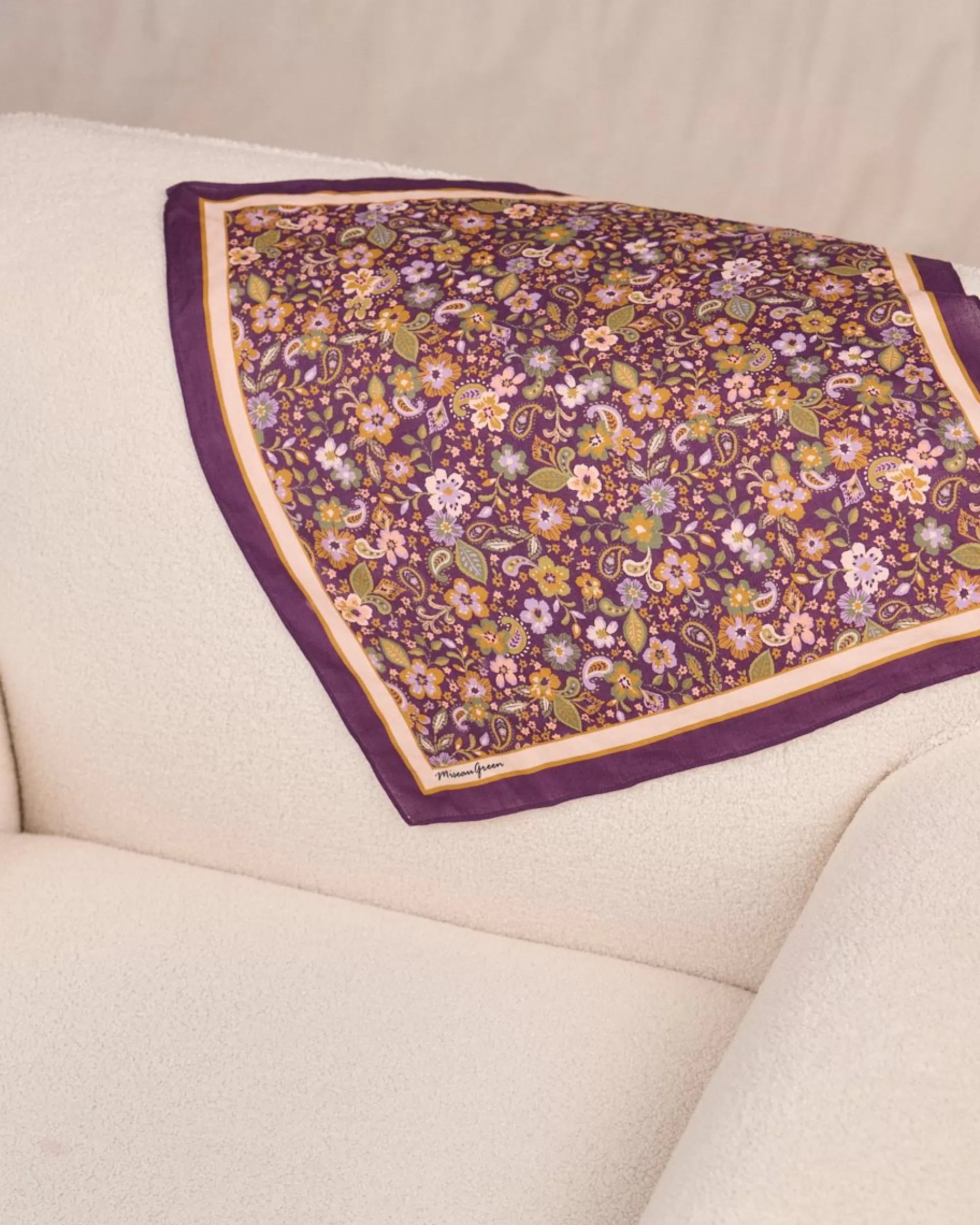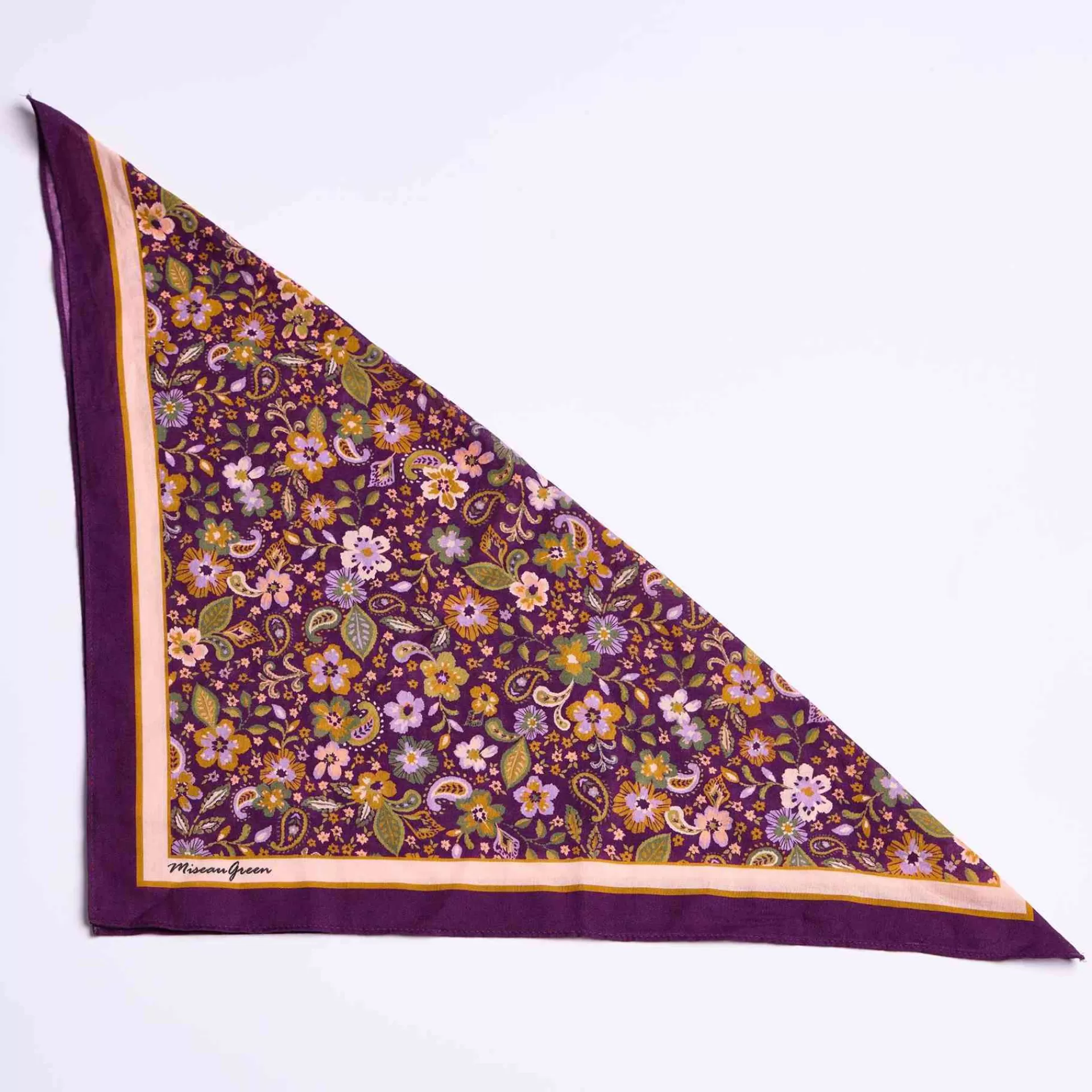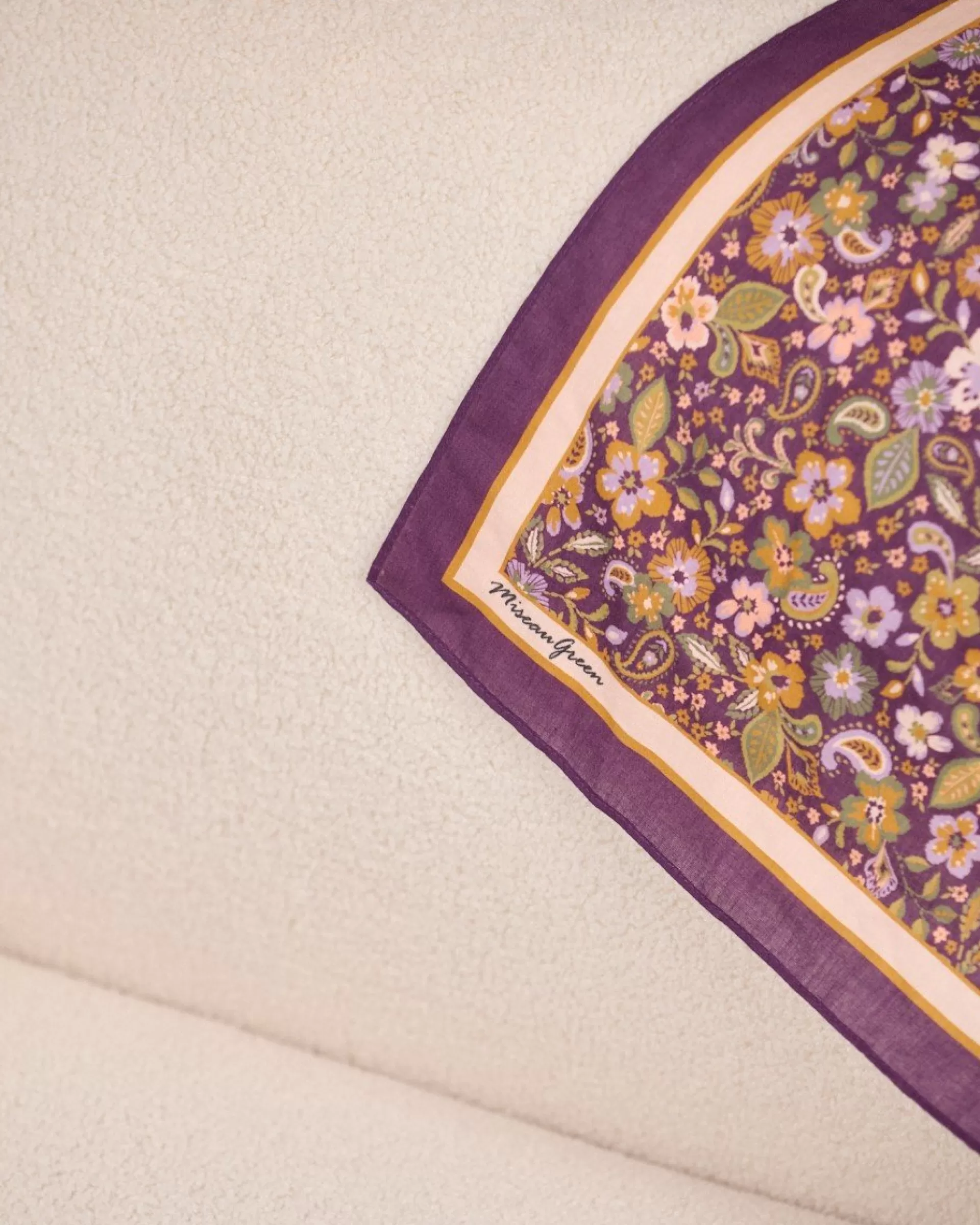 Élégant et romantique, ce foulard pour femme séduit par son motif fleuri multicolore et son coloris violet. Adoptez cet accessoire carré pour finaliser vos tenues ! Son étoffe douce et vaporeuse est confectionnée en coton recyclé. Ce modèle boho-chic se porte autour du cou ou dans les cheveux selon vos envies. C’est aussi un cadeau idéal à offrir !