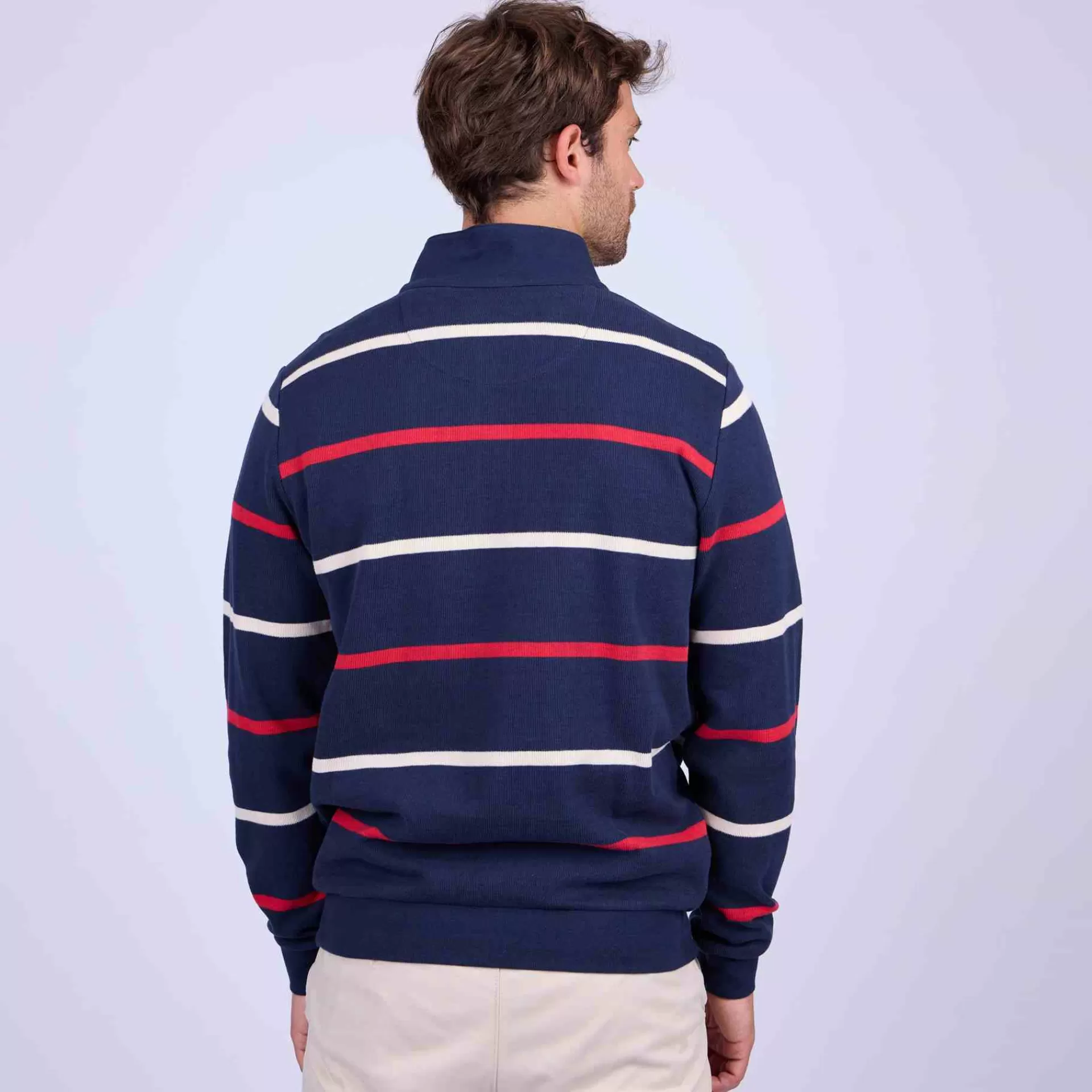 Un style chic et authentique avec ce sweat rayé pour homme ! Ce modèle est équipé d’un col camionneur zippé, d’une coupe droite et des finitions côtelées. Fabriqué à 100 % en coton, il est agréable à porter en toute saison. Avec son coloris bleu marine, il s’associe facilement et se porte aussi bien seul que par-dessus un tee-shirt. Une pièce fétiche pour des looks décontractés réussis !