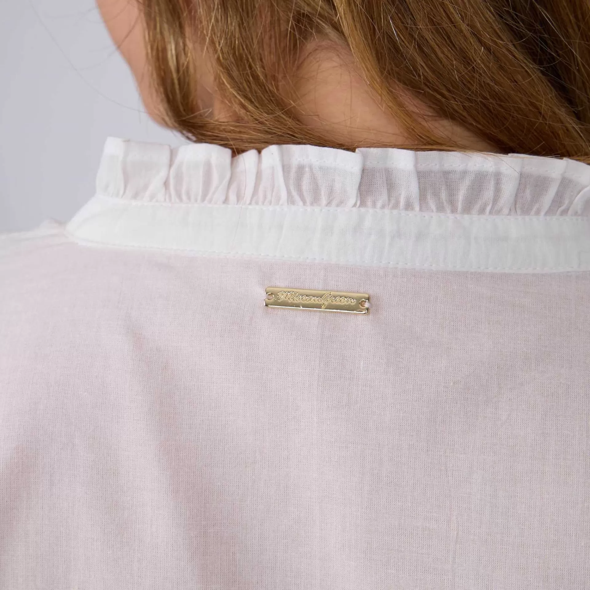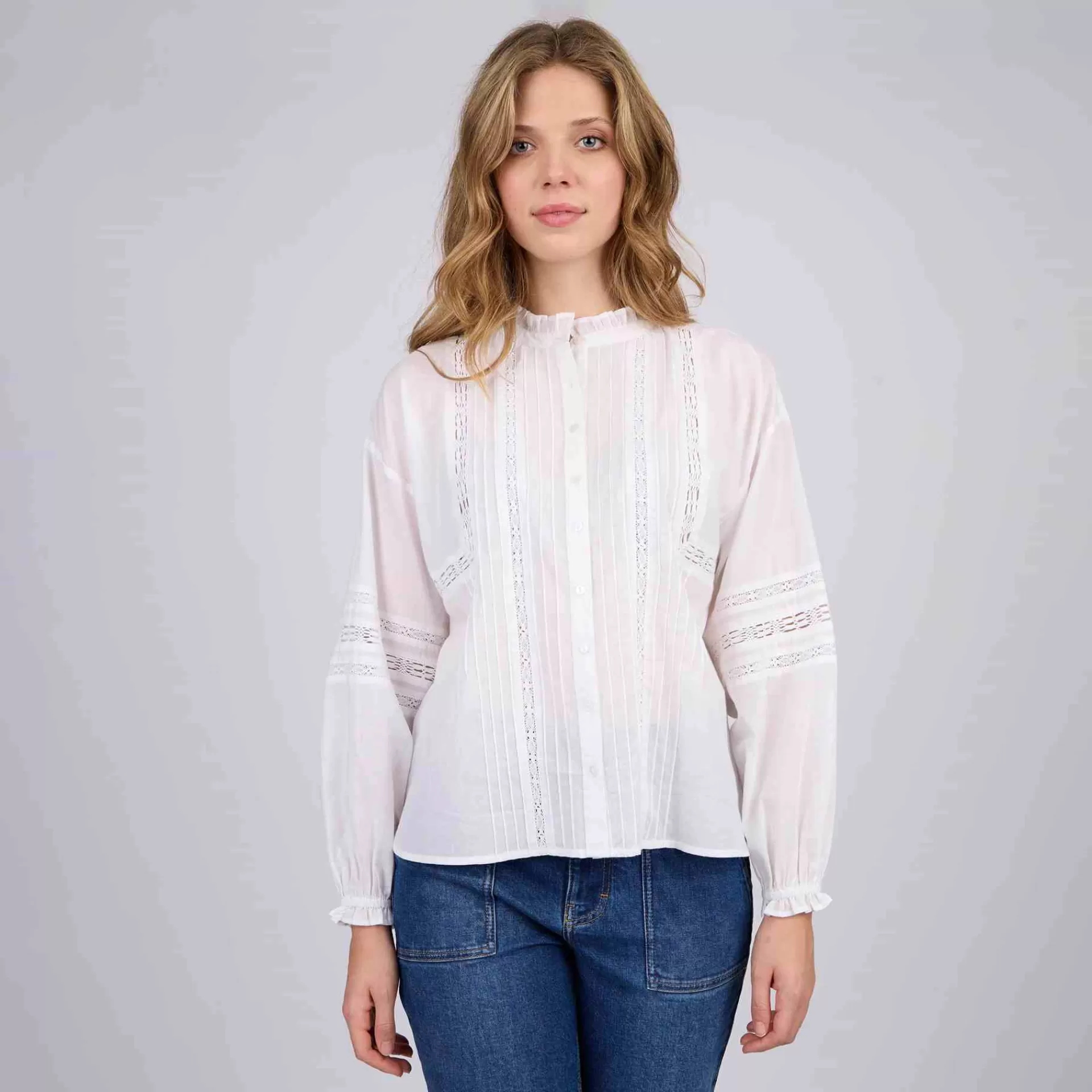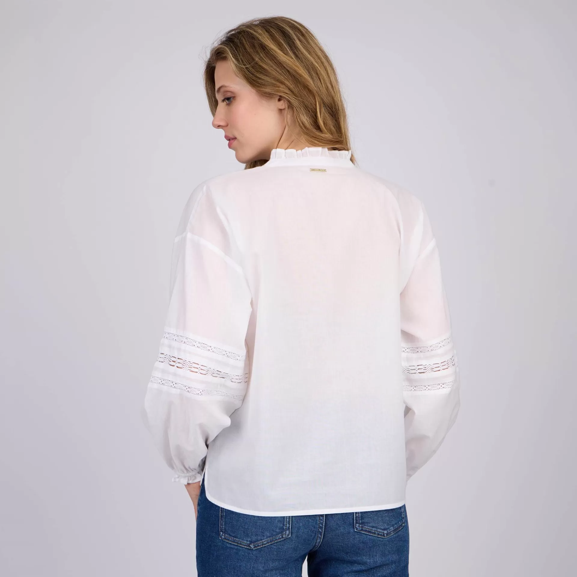 Le summum de l’élégance et du raffinement avec cette blouse blanche à manches longues ! Craquez pour ses empiècements en dentelle ajourée et ses détails volantés au niveau du col et des poignets. Son tissu réalisé en coton est légèrement transparent pour une allure plus douce. Parfaite pour une multitude d’occasions, elle est appropriée aussi bien pour le quotidien que pour des évènements plus formels !
